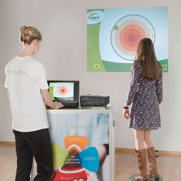 - Teilnehmerin steuert durch kontrollierte Bewegung der Platte unter ihren Füßen das Objekt am Bildschirm