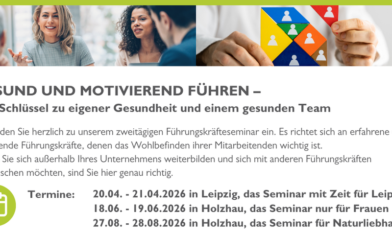 Dieser Termin richtet sich speziell an weibliche Führungskräfte. Weiterhin sind Frauen in den Führungsetagen unterrepräsentiert und es besteht wenig Gelegenheit sich mit anderen Frauen in Führungspositionen auszutauschen. Dies wollen wir bei diesem Termin ermöglichen und gehen neben den genannten Inhalten speziell auf die Fragen und Belange weiblicher Führungskräfte ein. Dieses Seminar wird im Naturhotel Lindenhof in Holzhau stattfinden und durch ein Rahmenprogramm zur eigenen Gesundheitsstärkung und Erholung begleitet.