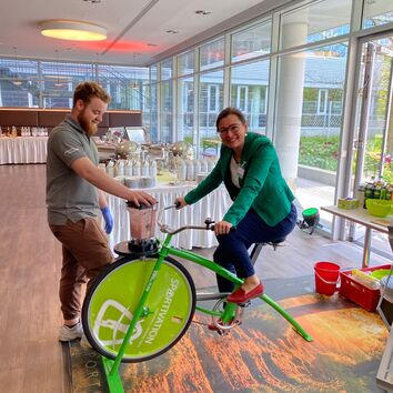 Wie lässt sich der Zusammenhang von Bewegung und Ernährung besser verdeutlichen, als auf einem Smoothiebike? Erleben Sie den Smoothiemixer, der durch eigene Muskelkraft betrieben wird, und nutzen Sie es für einen zwanglosen Einstieg in das Thema Ernährung und zur Sensibilisierung Ihrer Mitarbeiter.